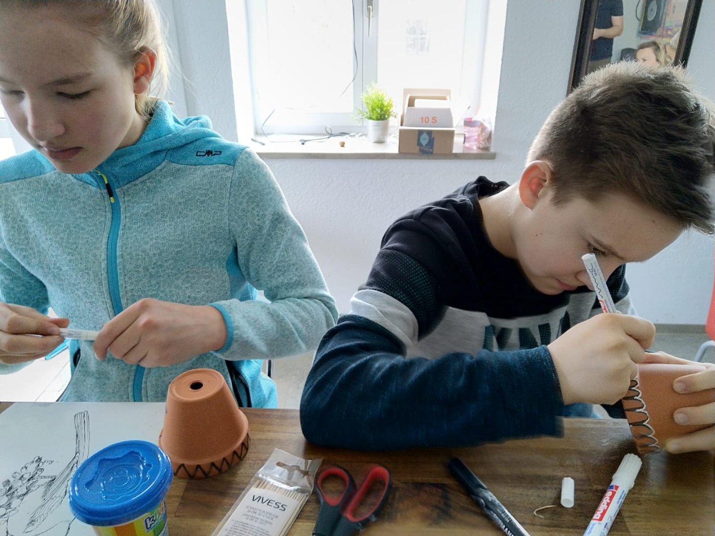 Zunächst einmal durften die 18 Kinder kleine Tontöpfe mit Farben und Stiften individuell verzieren. Um die Futterglocken später aufhängen zu können, wurden Schnüre durchgefädelt und innen mit einem Stöckchen befestigt.