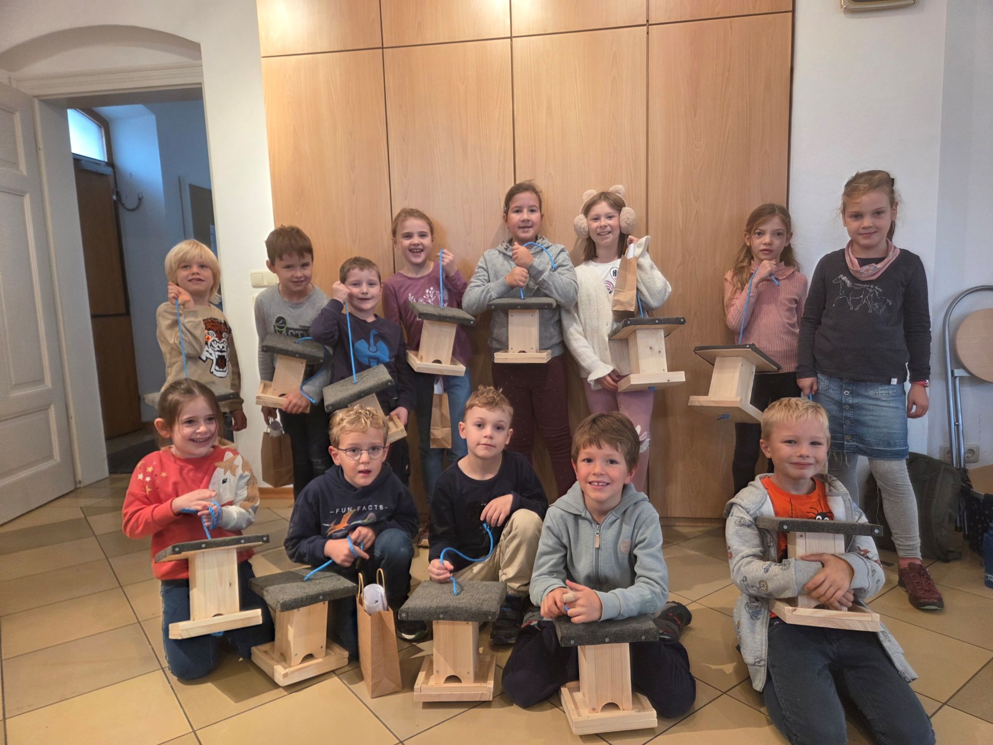 15 fleißige kleine Handwerker haben eine Futterstation für Vögel gebaut. Das habt ihr wirklich super gemacht!!!