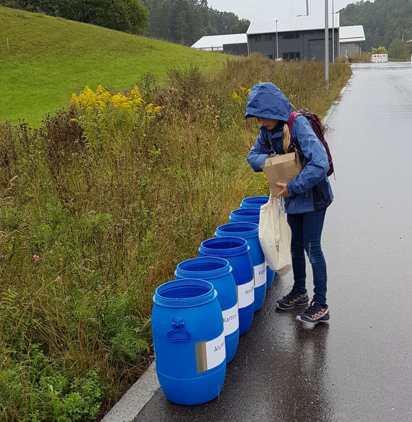 Weiter ging es in Richtung Gewerbegebiet, Gitte führte die Gruppe zu einem kleinen improvisierten "Wertstoffhof". Das war unsere zweite Station "Verwertung und Vermeidung von Müll". Nach der Einführung ins Thema bekam jedes Kind eine Schachtel mit verschiedenen Wertstoffen, die sie auf Zeit in die entsprechenden Behälter einwarfen. Das beste Ergebnis hatte erstaunlicherweise die kleinste Teilnehmerin. Für ihre Bemühungen erhielten alle Kinder ein weiteres Brettchen.